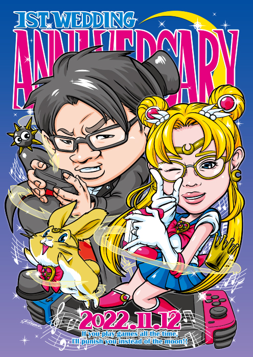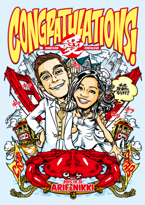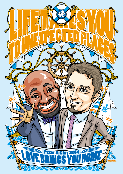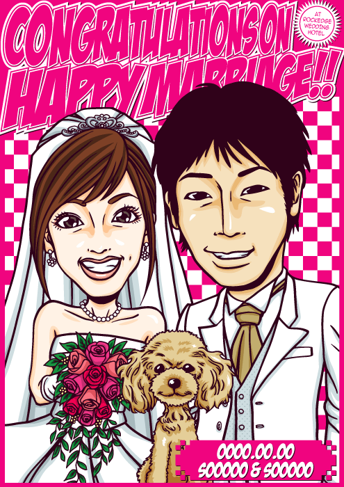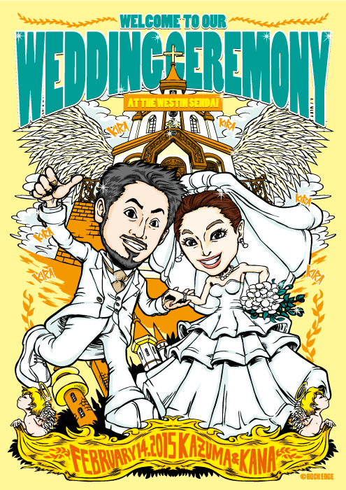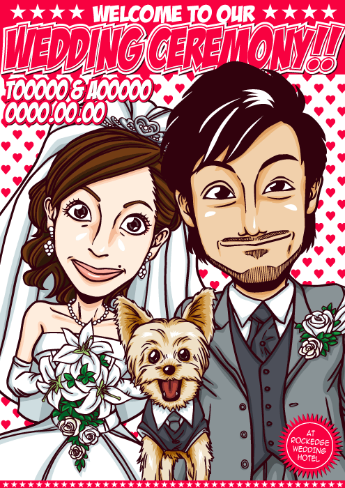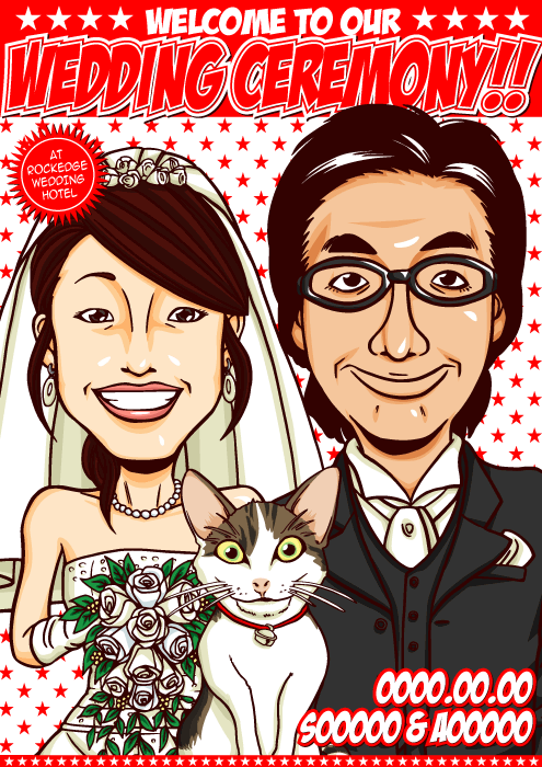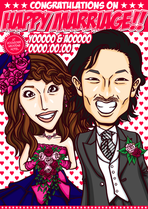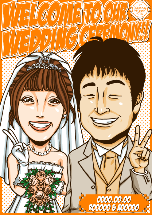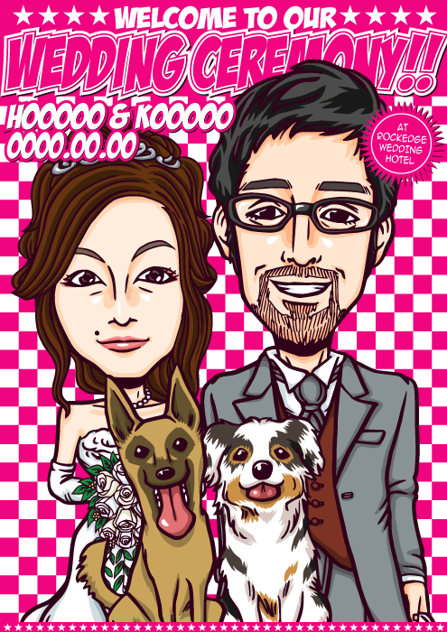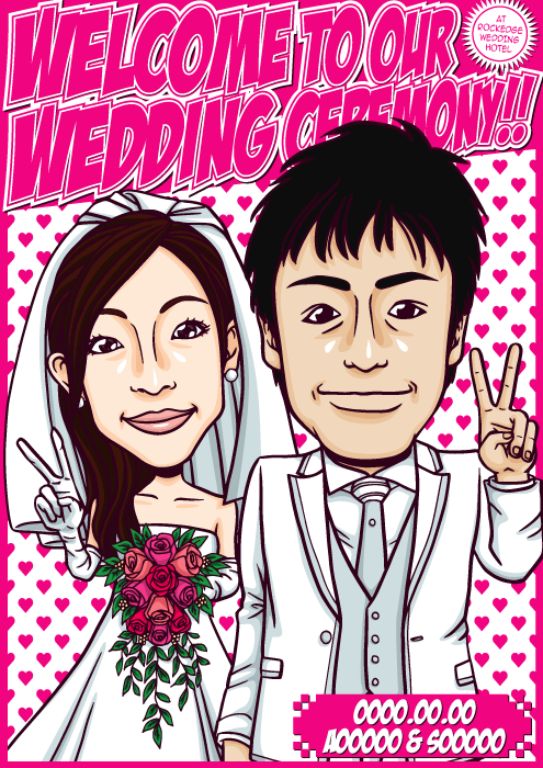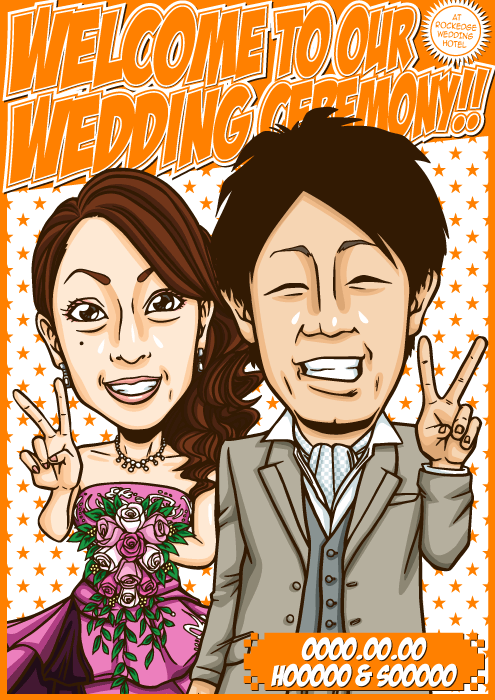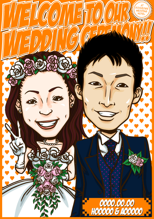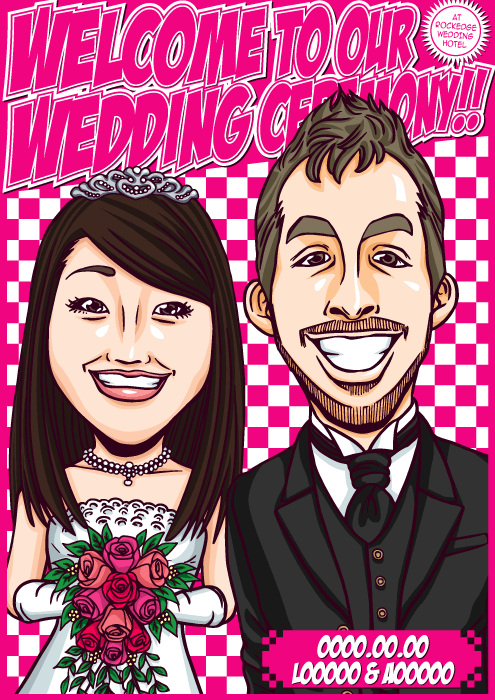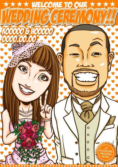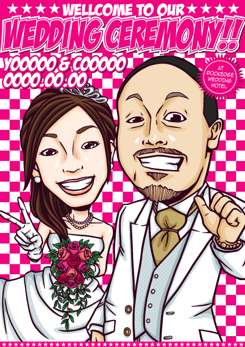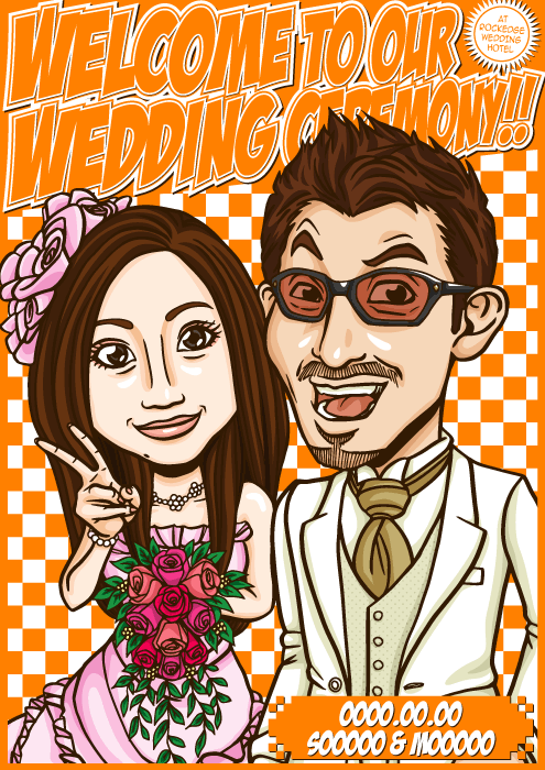 衣装やポーズはもちろん、BACKにあしらうイラストからデザインまで、お客様の背格好・雰囲気などを確認させていただいた上で、世界にたった一つしか無い、お客様だけの似顔絵ウェルカムボードを完全オリジナルで描き下ろします!「こんなイメージで描いてほしい!」と言うご要望に全てお応えします!人と同じものは嫌なこだわり派のお二人に送る、完全オリジナルの「ちょっとカッコイイ似顔絵ウェルカムボード」です。