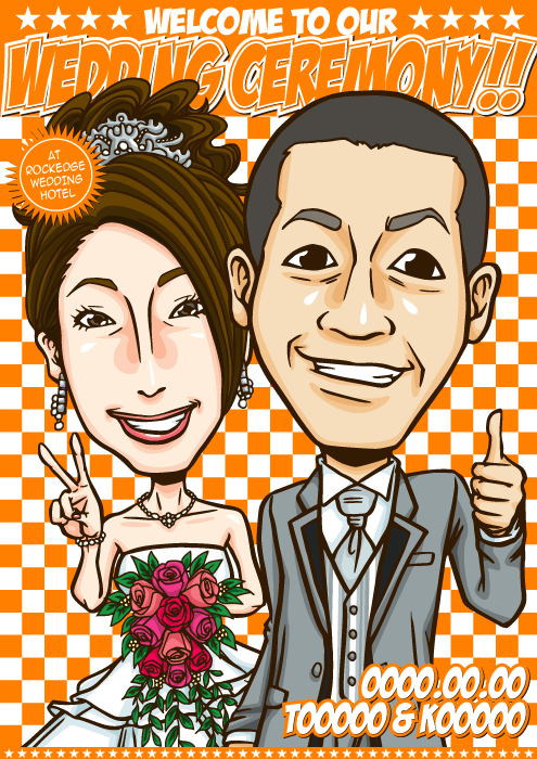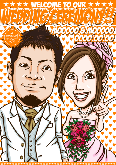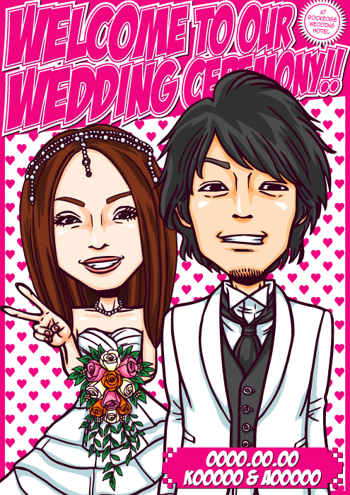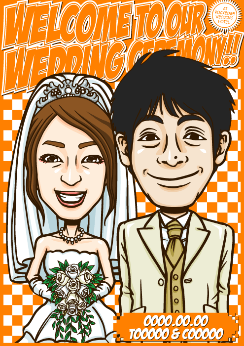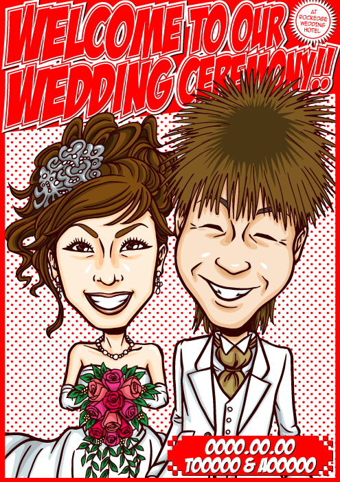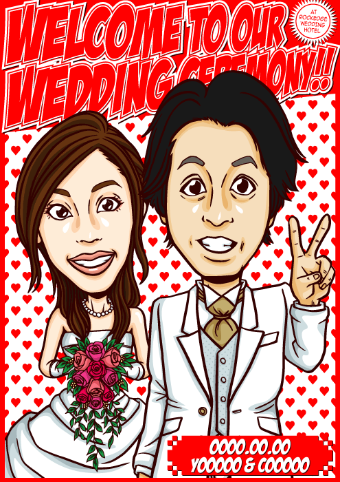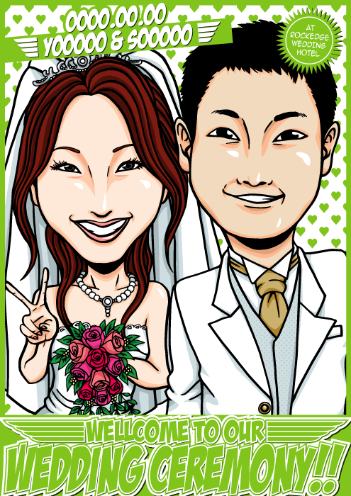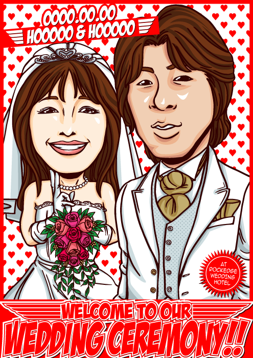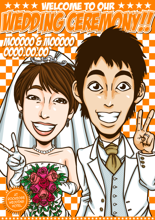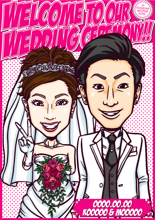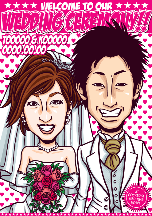 人と同じものは嫌なこだわり派のお二人に送る、完全オリジナルの「ちょっとカッコイイ似顔絵ウェルカムボード」です。