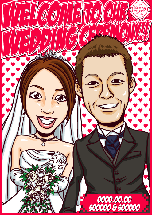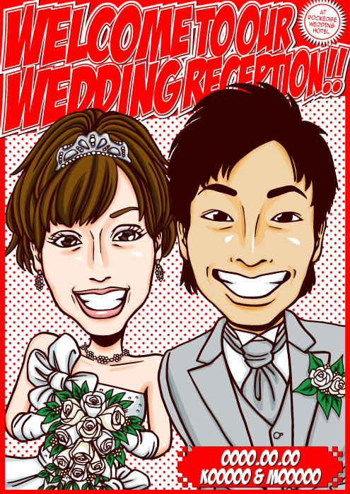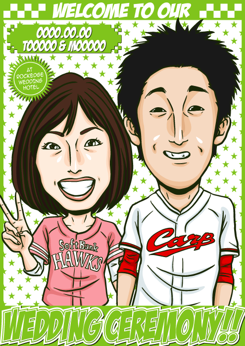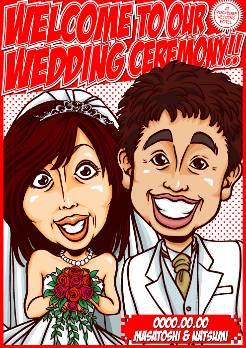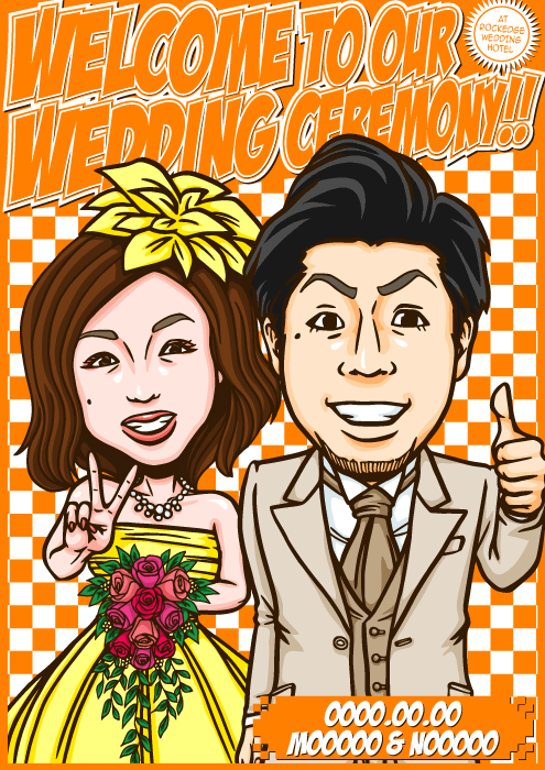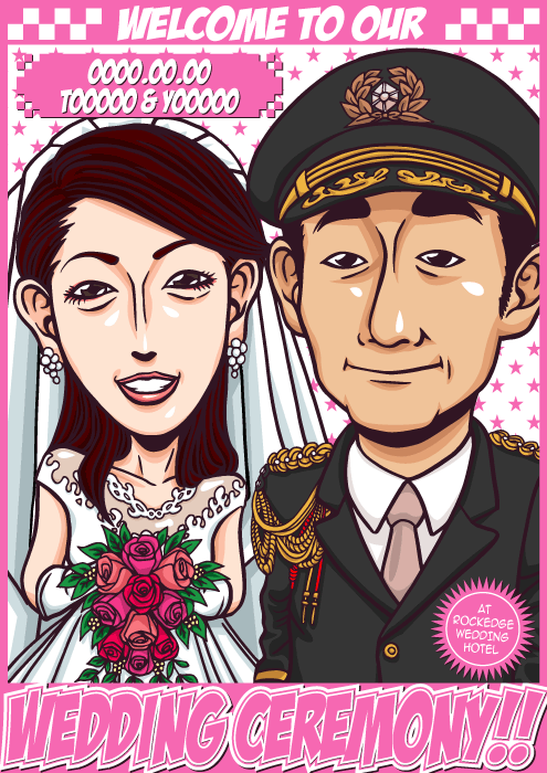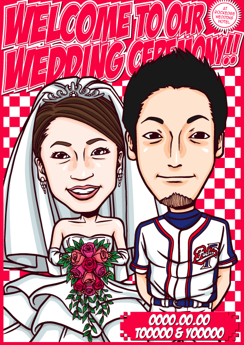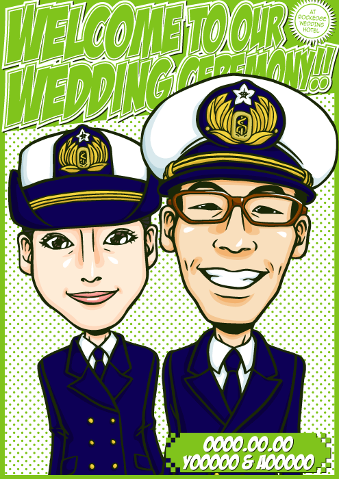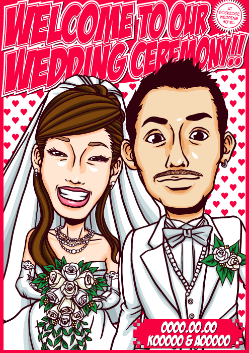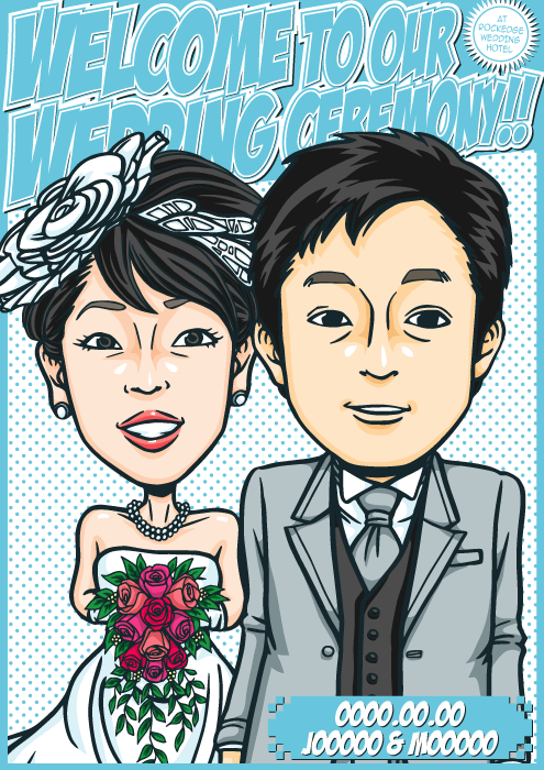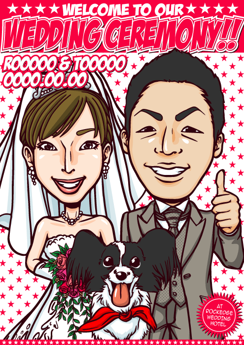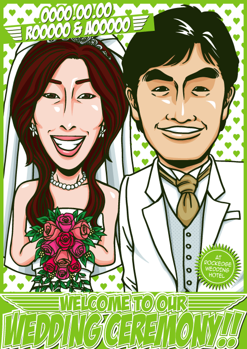 人と同じものは嫌なこだわり派のお二人に送る、完全オリジナルの「ちょっとカッコイイ似顔絵ウェルカムボード」です。