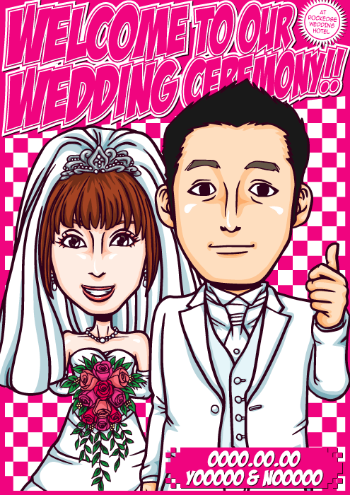 衣装やポーズはもちろん、BACKにあしらうイラストからデザインまで、お客様の背格好・雰囲気などを確認させていただいた上で、世界にたった一つしか無い、お客様だけの似顔絵ウェルカムボードを完全オリジナルで描き下ろします!